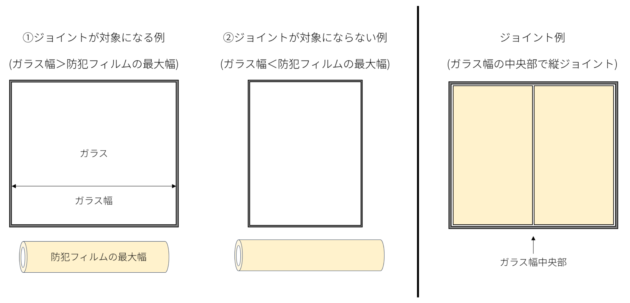 (注2) 防犯性能を確保するため、窓全面に貼付する「全面貼り」を行い、窓の一部にフィルムを貼付する「部分貼り」は認めないものとする。 - 2)フィルムの最大幅を超える幅をもつ対象ガラスにおいて、防犯フィルムをガラス幅中央部で縦にジョイント施工した場合は対象とする。